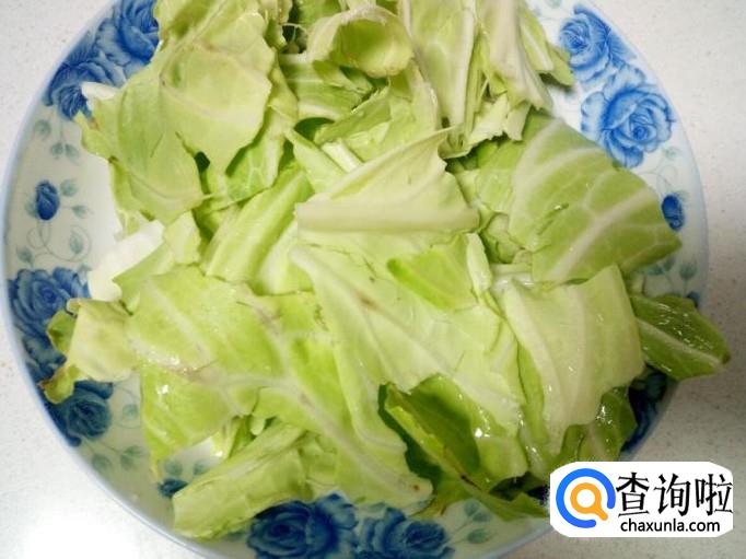 卷心菜用手撕成片,用水清洗干净,控干水分。