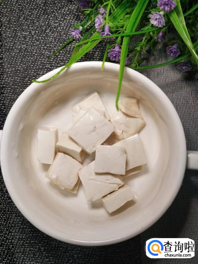 准备适量嫩豆腐,洗净后切块,放入锅中焯水,然后捞出,放在一个比较深的容器中,因为蒸熟之后,有可能会出水,容器深一点比较好。
