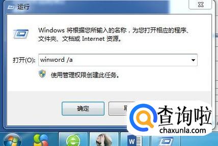 在运行窗口里面输入“winword /a”,并按回车键。如下图。
