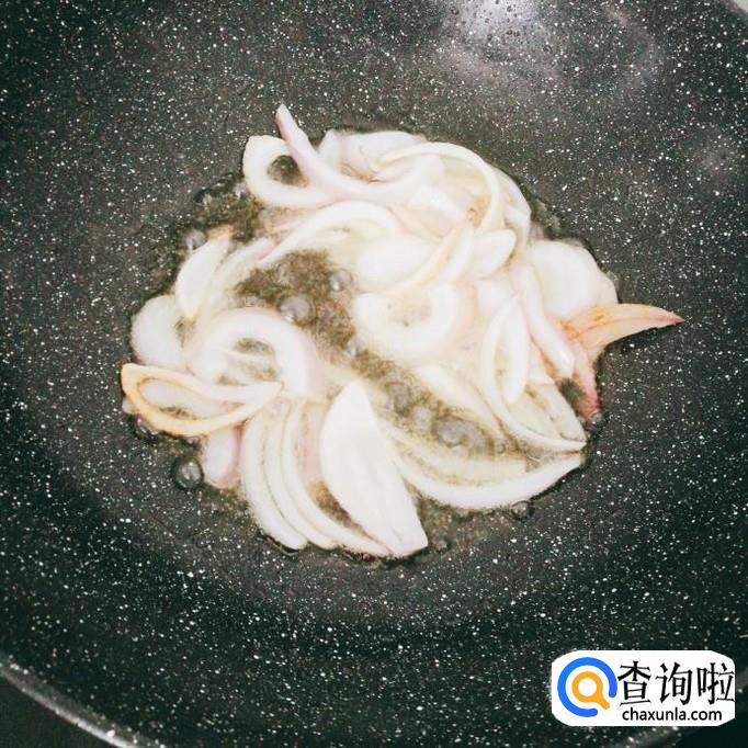 将锅底烧热后,加入橄榄油,待油温起来后,倒入洋葱翻炒。