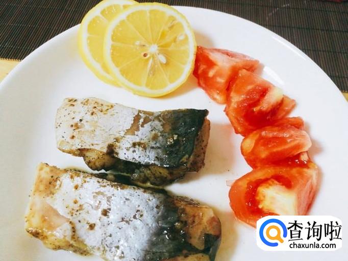 将巴沙鱼块放入盘中,切一个小番茄,再加两片柠檬就摆盘成功啦!