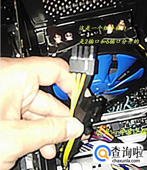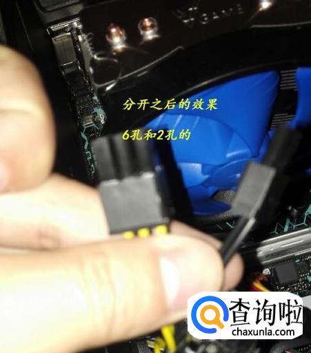 安装8孔供电线。有的电源显卡供电线分为6+2孔,这个时候我们只需要把2个分开的供电线卡在一起,组成八孔的供电线。如下图所示。
