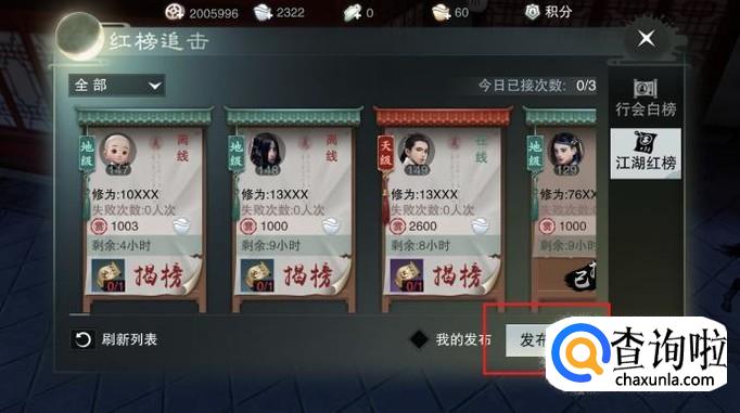 在红榜追击界面,点击右下方的“发布悬红”选项。