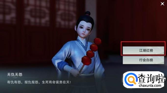 与无仇无怨进行对话,在对话选项中,点击“江湖红榜”。