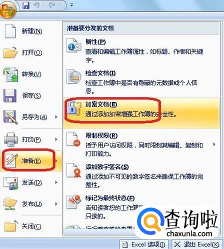然后,我们点击左上角的“office”按钮,弹出下拉菜单,我们选择“准备”,“加密文档”。