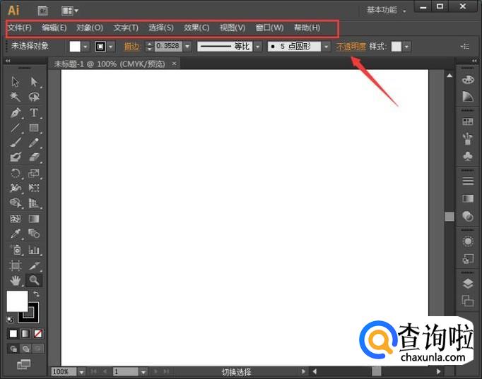 将AI这款软件打开之后,在最上面就可以找到菜单栏,在这里我们就可以选择我们需要的命令和功能,如图所示: