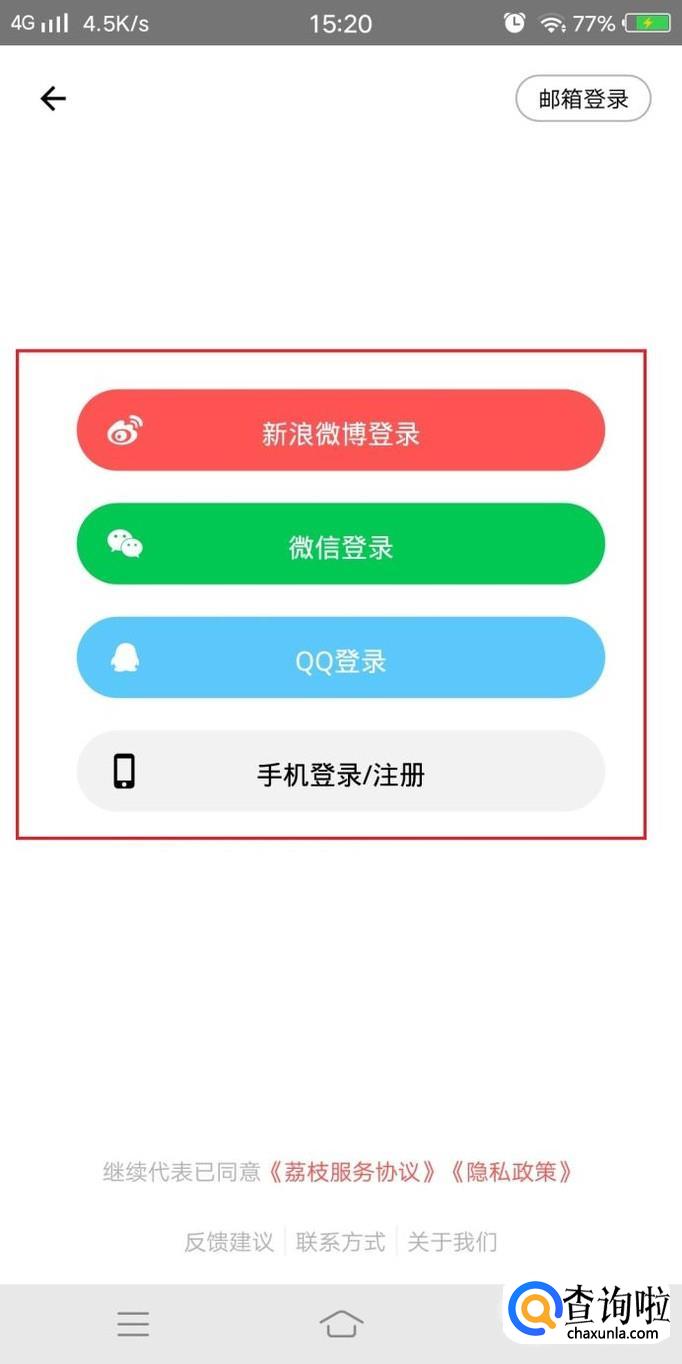 荔枝FM可以选择第三方应用微信、微博、QQ或者手机号码进行注册/登录,如图所示