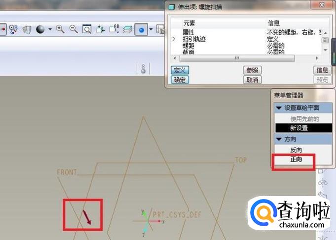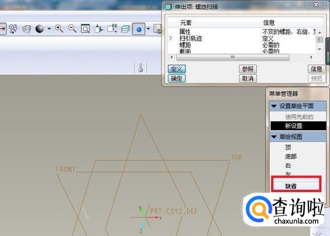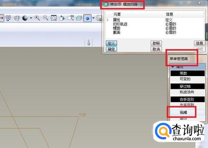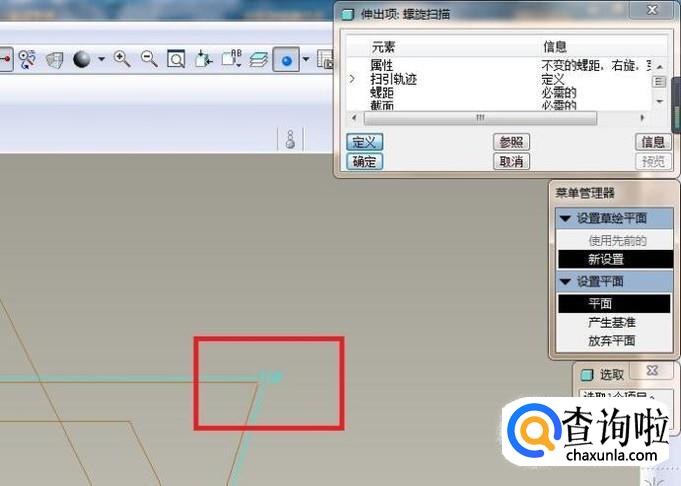 软件随之弹出了“伸出项:螺旋扫描”对话框和一个菜单管理器,