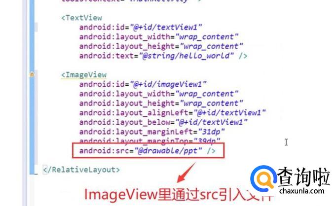 接下来我们打开ImageView的资源定义文件夹,用src属性引入图片文件,如下图所示