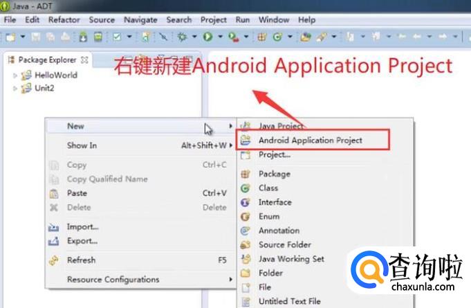 首先我们打开Java ADT软件,在左侧空白处右键单击选择New下面的Android Application Project选项,如下图所示