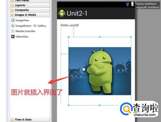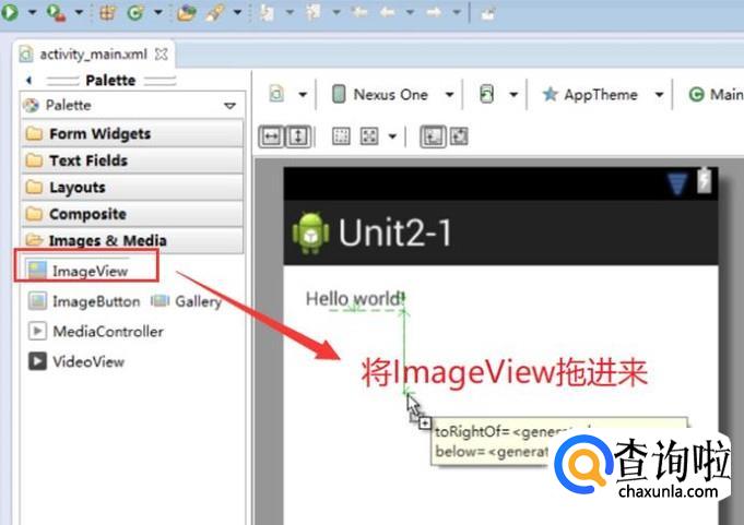 接下来我们在控件列表中找到ImageView控件,将其拖拽到模拟器界面中,如下图所示