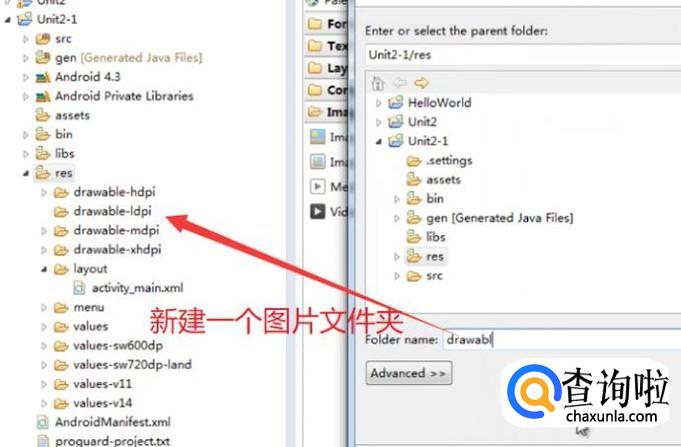 然后我们在res文件夹下面新建一个drawable文件夹,如下图所示