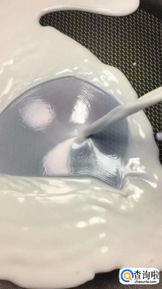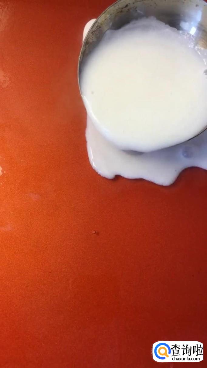 然后把烧开的牛奶平铺在披萨盘上,如下图所示。