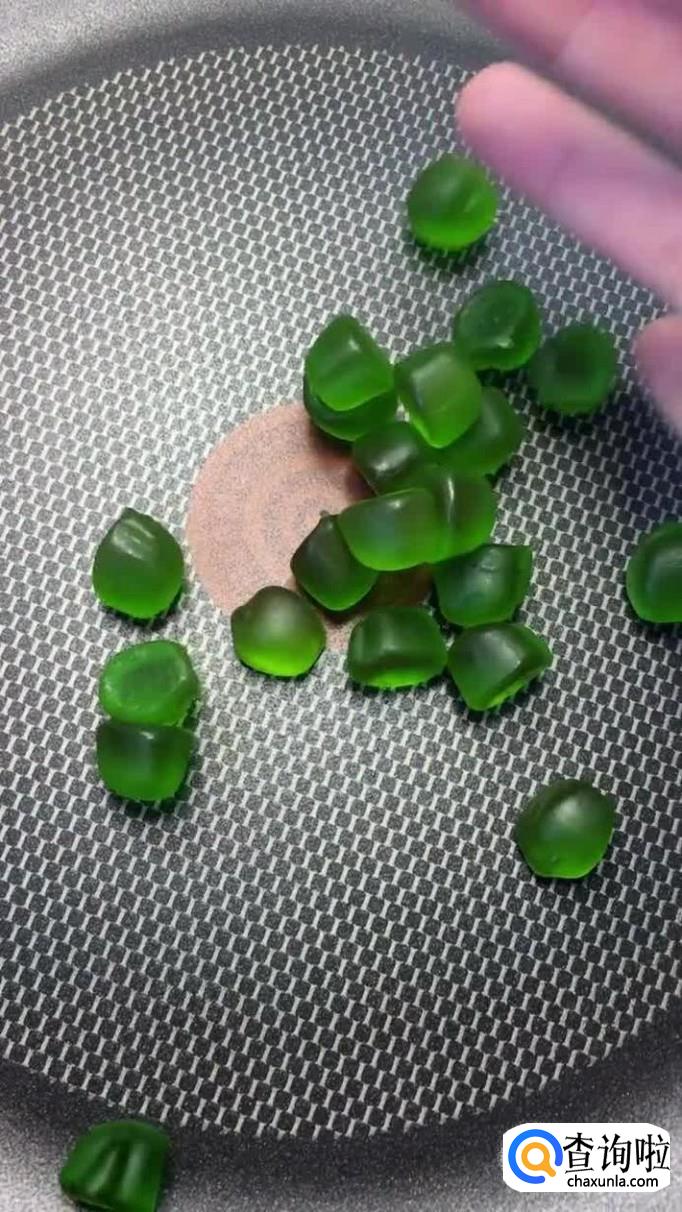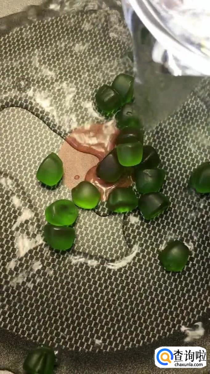 接着锅中放入适量的绿色QQ糖,如下图所示。