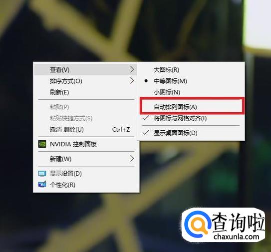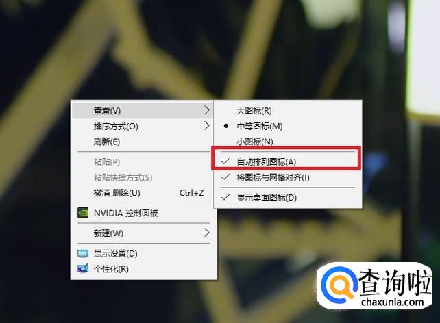 点击“自动排列图标”选项,取消前面的“√”,即可将桌面图标随意移动固定到桌面的任何位置。