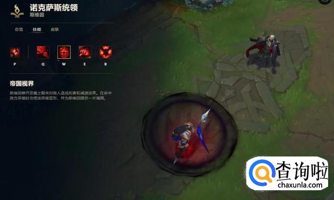 W技能是帝国视野,就是放出一个技能圈,在这范围内会受到乌鸦的伤害并减速