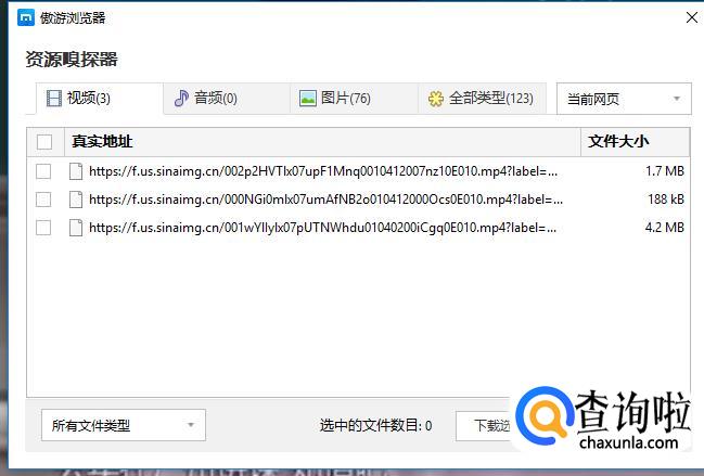 资源嗅探器会查找到该页面的视频、图片等资源,选中要下载的视频,点击下载即可。