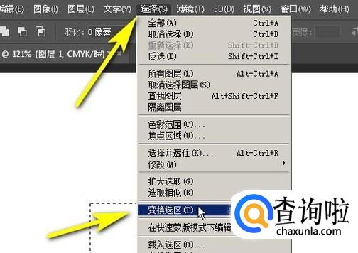 想要把这选区放大或缩小。那么,可以这样操作:鼠标移到选择菜单这里,点击,弹出下拉菜单再点:变换选区