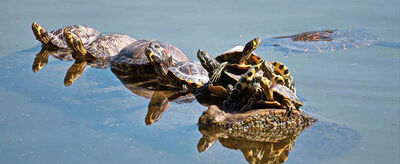 乌龟属半水半栖、半陆性爬行动物。主要栖息于江河、湖泊、水库、池塘及其他水域。白天多陷居水中。夏日火热时,便成群地寻找荫凉处。性情温和,相互间无咬斗。遇到敌害或受惊吓时,便把头、四肢和尾缩入壳内。同时乌龟是杂食性动物,以动物性的昆虫、蠕虫、小鱼、虾、螺、蚌、植物性的嫩叶、浮萍、瓜皮、麦粒、稻谷、杂草种子为食,耐饥饿能力强,数月不进食也饿不死。