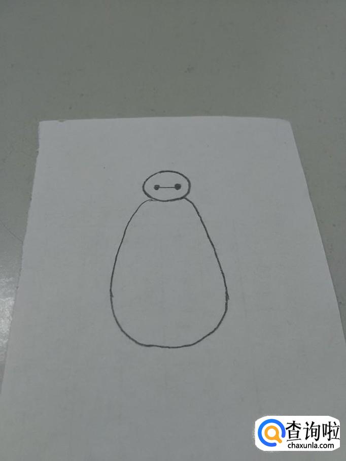 在头部下面,画一个鸡蛋的形状,上窄下宽,表示大白的身体。