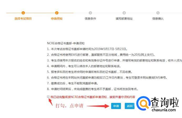 勾选“我已经完整阅读NCRE台格证书直邮申请须知,接受并遵守须知内容。”然后点击“同意”。