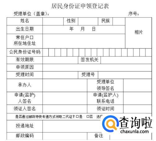 申请表:《居民身份证申领登记表》或《居民身份证异地受理登记表》
