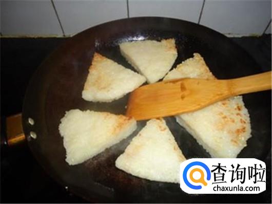 接着把切好的米糕放进去,煎至两面金黄。