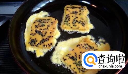 然后把鸡蛋和黑芝麻搅拌均匀,淋在米糕上面,等到鸡蛋煎熟就可以出锅了。