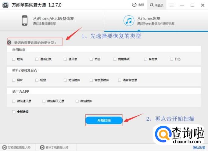 选择数据类型,也就是误删除的iCloud备份好的文件类型,选择后点击下一步开始扫描。