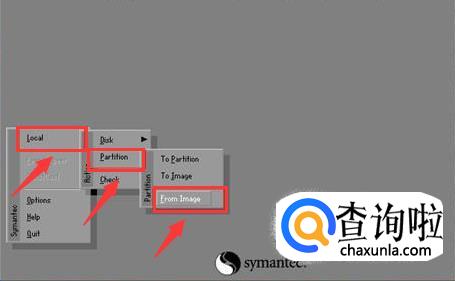 然后就可以选择系统恢复了,右键点击该页面,选择第一页的【Local】,在选择第二页的【Parfifion】,最后选择第三页的【From Image】。