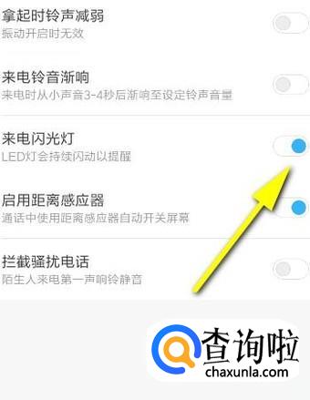 再转到另一个界面,这时,我们就看到有:来电闪光灯;手指在“来电闪光灯”右侧的开关中,点住滑块向右边滑,开启来电闪光灯的功能。