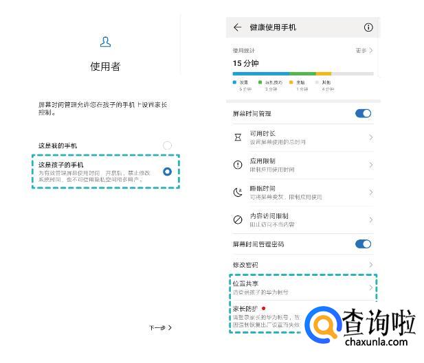 选择是孩子的手机后,在主界面点击位置共享,进入位置共享界面。家长手机在应用市场下载家长助手,扫描位置共享的二维码,可以定位孩子的位置。在主界面点击家长防护,进入家长防护界面。登陆家长的华为账号,可以防止“屏幕时间管理”的设置因为强制恢复出厂而失效。打开此功能,帮助家长守护孩子安全