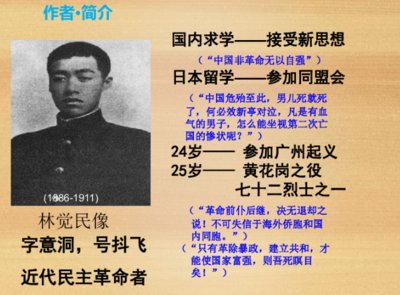 《与妻书》创作背景:1911年,林觉民受同盟会第十四支部派遣回闽,联络革命党人,筹集经费,招募志士赴广州参加起义。他依依不舍地告别家人,率第一批义士从马尾港上船赴香港。广州起义(又称黄花岗起义)的前三天,即4月24日,林觉民与战友在香港滨江楼同宿。