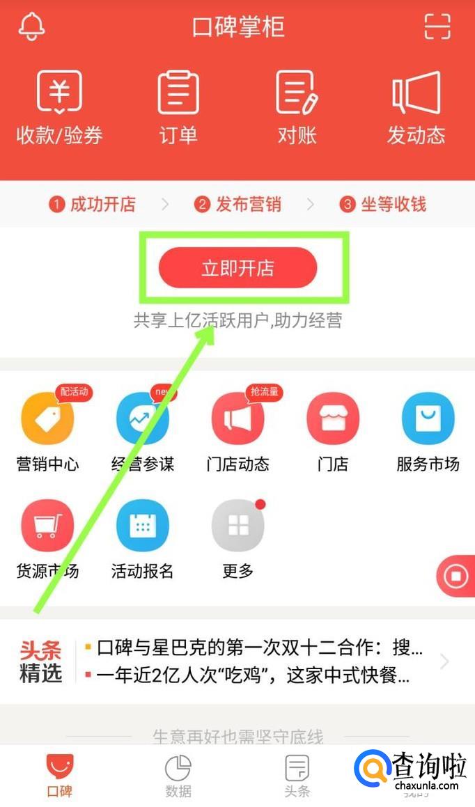 在“口碑”首页中央找到“立即开店”,点击进入。