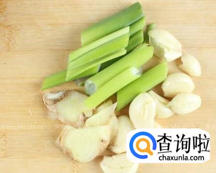 将小鲫鱼去掉鳞和内脏,用清水洗净,再把葱、姜、蒜切成均匀的块。