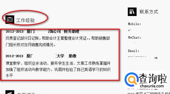 然后再填写一下自己的工作经验,比如有的人大二就开始去找实习,那么这些工作经验都是可以填写的;若是没做过工作,那么就写自己的毕业设计,比如使用用Myeclipse、JBuilder和Oracle工具,做了一个办公自动化系统等等。