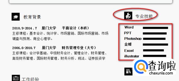 指的是会熟练操作哪些常见且有用的软件,比如办公软件(word,PPT,Excel),如果你要去面试Java程序员,那么就对应地协商自己会的软件(Editplus,Eclipse,Myeclipse插件和Oracle等等);如果是面试英语专业,那么就先填写考过几级英语,比如CET-6证书就是必填的,然后再随便填几个与英语相关的即可。