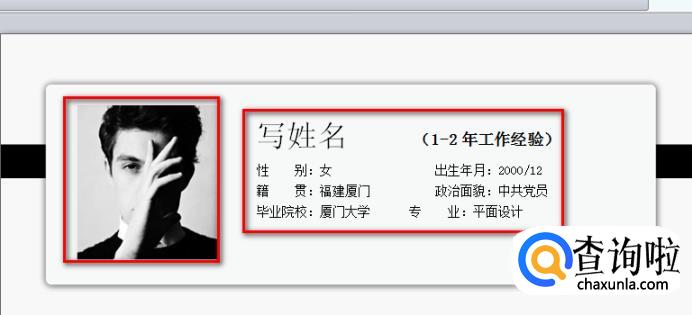 打开下载后的简历模板,然后再填入个人基本信息,包括姓名、性别、政治面貌、住址、出生年月、籍贯和专业等等,长得好看端正的人,还可以贴上一张2寸的免冠照片,要按实际填写。