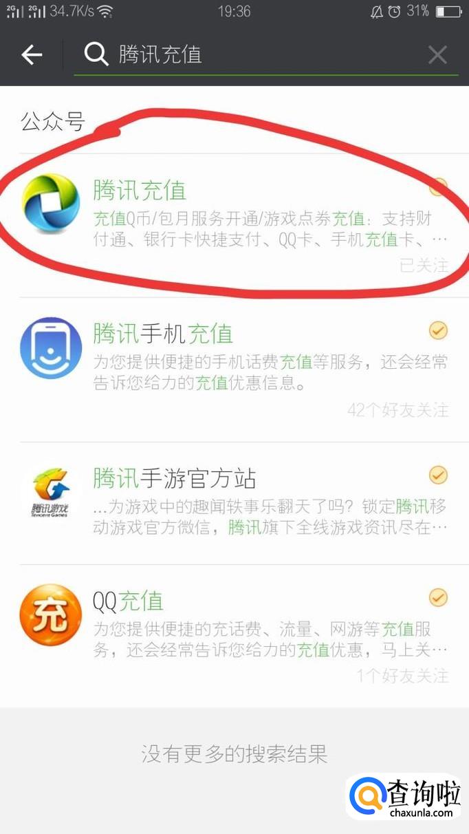 在搜索框中输入“腾讯充值”,在搜索结果页找到腾讯充值的公众号然后进入下一个操作。