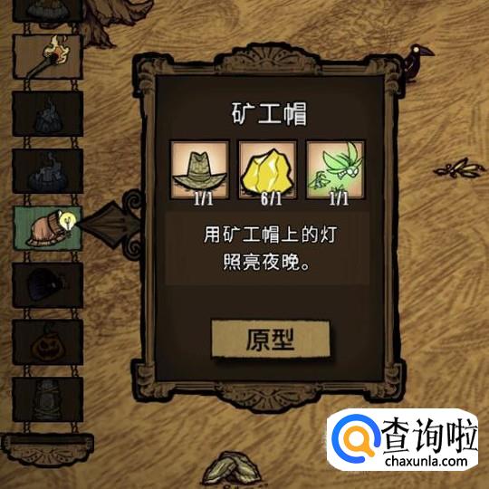 好了,大功告成,接下来在衣物栏里面造一个草帽,靠近一本就可以合成矿灯帽了,持续时间是7分48秒,熄了可以添加发光浆果或者萤火虫继续发光。