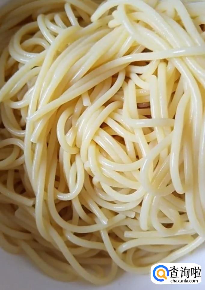 首先我们将意大利面放入开水锅中,放入适量的盐,煮熟捞出过凉,控干水分,放入碗中备用