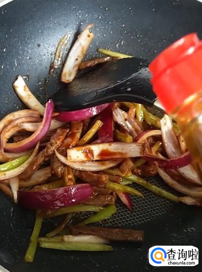 接着我们放入切好的洋葱与青红椒,倒入适量的番茄酱与胡椒酱,翻炒均匀