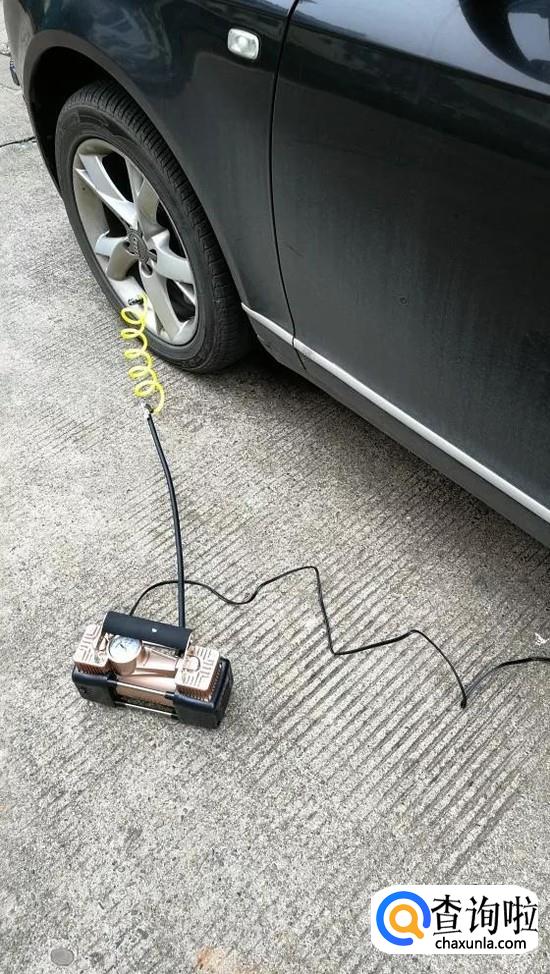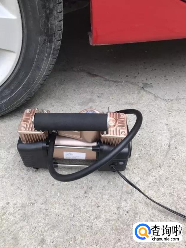 打开引擎,将充气泵摆放平整之后,打开充气泵,当表数到达汽车适当胎压时就停止充气泵工作,完成充气达到数值后会自动停止