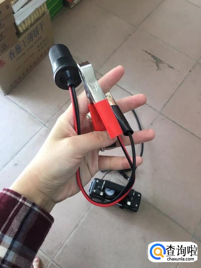 把电源线接好,然后把鱼夹夹在汽车电瓶正负极上,黑色为负极,红色为正极。