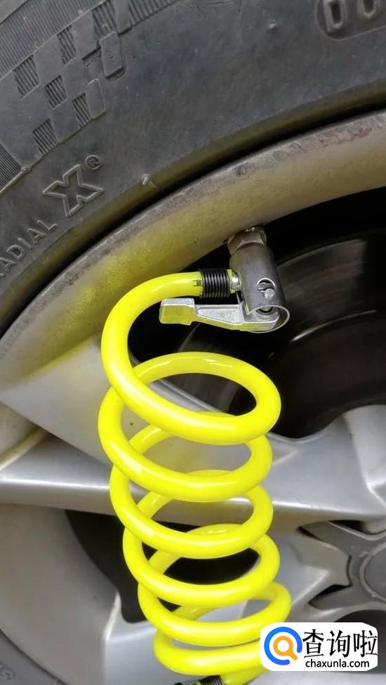 把延长管的一端和充气泵的黑色高压管相连,再把延长管的尾端气嘴与轮胎螺牙气门相连。