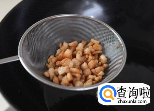 等煮到那肥肉,慢慢缩小,油越来越多的时候,准备一个大碗装油出来,再煮肥肉之前锅里不能有水,这样油会出来更快。