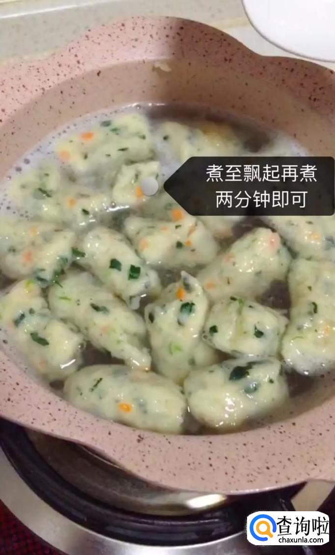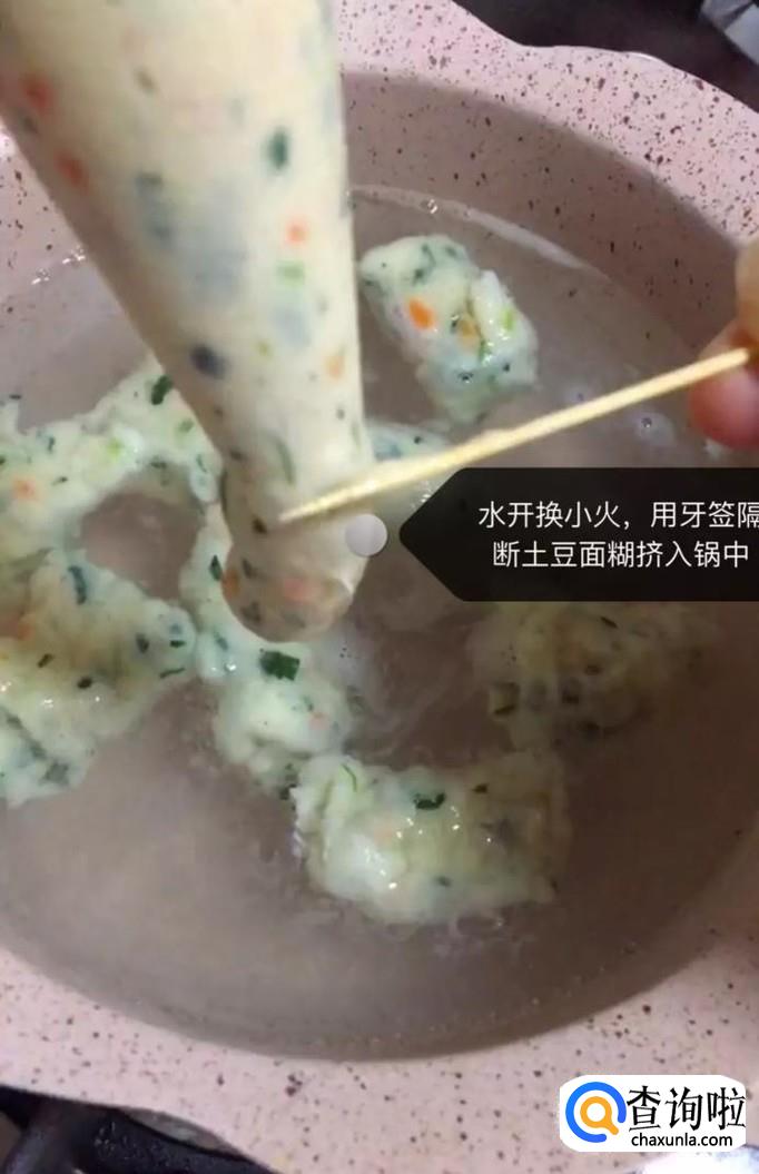 接着将食材装进裱花袋,锅中放入适量的清水,待水烧开,将食材挤入锅中,如下图所示。