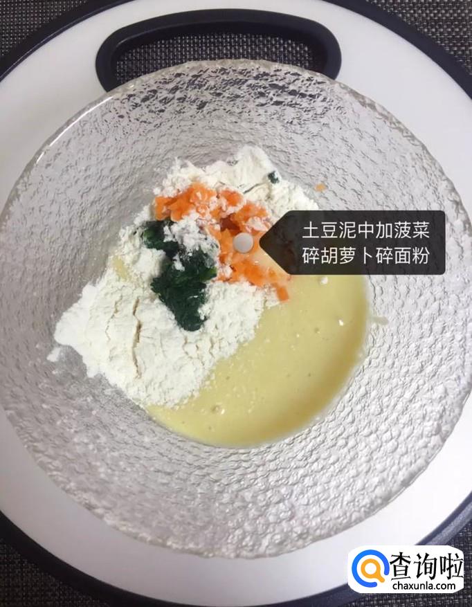 然后加入菠菜、胡萝卜和面粉,搅拌均匀,如下图所示。