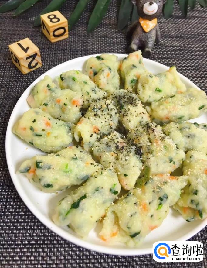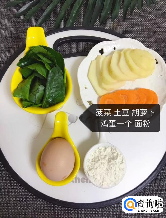 首先准备好所有要用到的食材,如下图所示。小贴士:菠菜适量,土豆一个,胡萝卜适量,鸡蛋一个,面粉150克。
