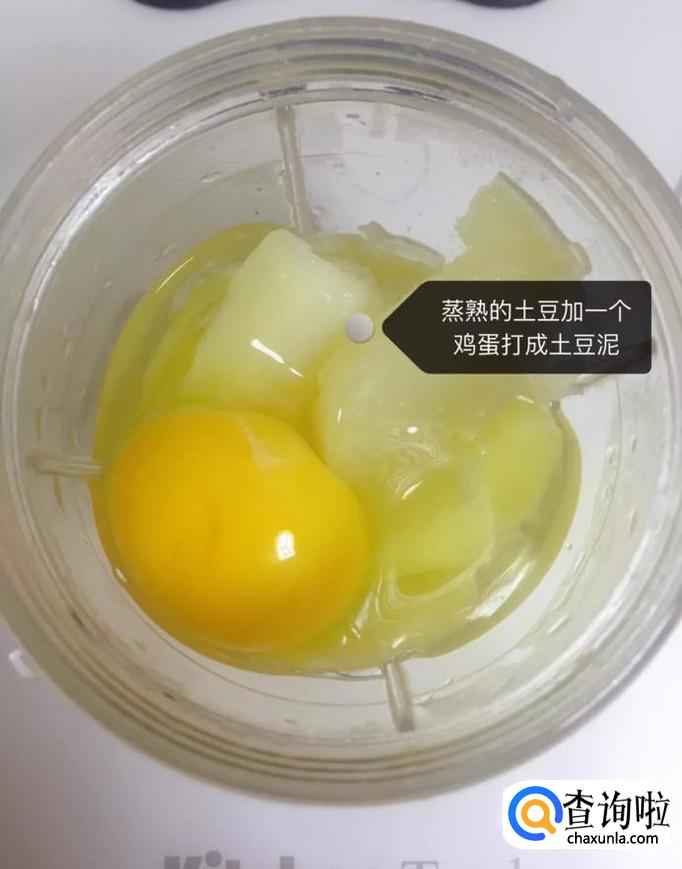 接着将蒸熟的土豆倒进料理机并打入一颗鸡蛋,打成泥,如下图所示。